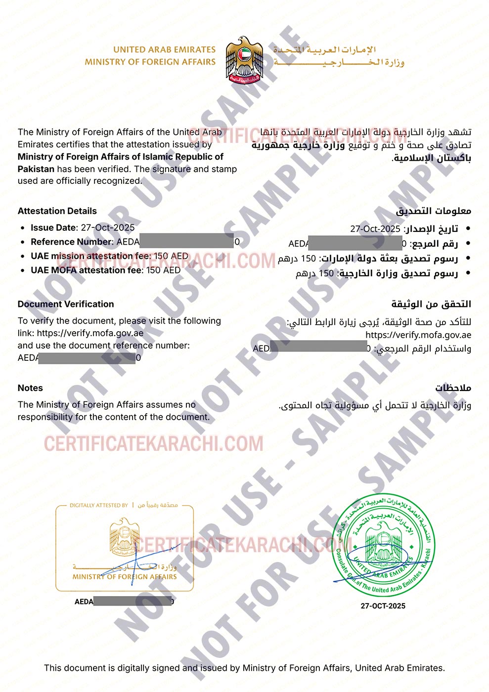 After completion of attestation process embassy will return the original document along-with a letter containing Reference Number to check and verify digital attestation online at official website of UAE Ministry of Foreign Affairs. Link: https://verify.mofa.gov.ae